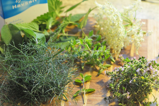 here we have sage, bronze fennel, oregano, thyme, and elderflower. i also had a few stinging nettles, some parsley, lovage and a few sprigs of mint for freshness. i'm going to make another batch or two including garlic now that we've harvested that as well.