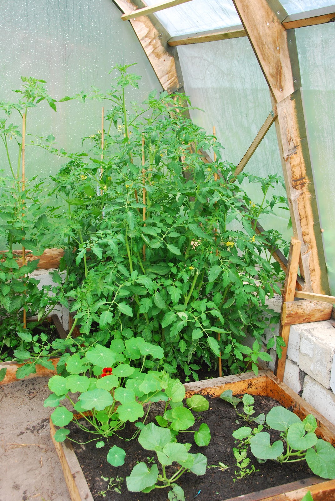 cherry tomatoes and regular tomatoes are bushing out nicely. in our climate, we just can't grow tomatoes outside of a greenhouse, it just never gets warm enough.