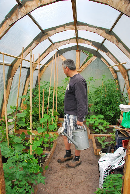 i promised an update post as to how much things changed here at mantorpgård while sabin and i were away. if you want a refresher of how it looked mid-july, go here. just as i suspected, the plants have taken over the greenhouse! in fact, it's a little overwhelming! we're eating loads of cucumbers and putting colorful nasturtiums on our salads.